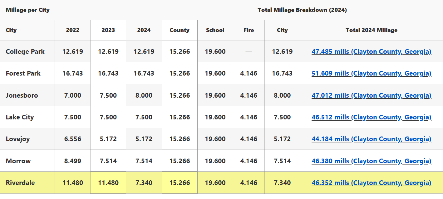 | Riverdale | 11.480 | 11.480 | 7.340 | 15.266 | 19.600 | 4.146 | 7.340 | 46.352 mills (Clayton County, Georgia) |